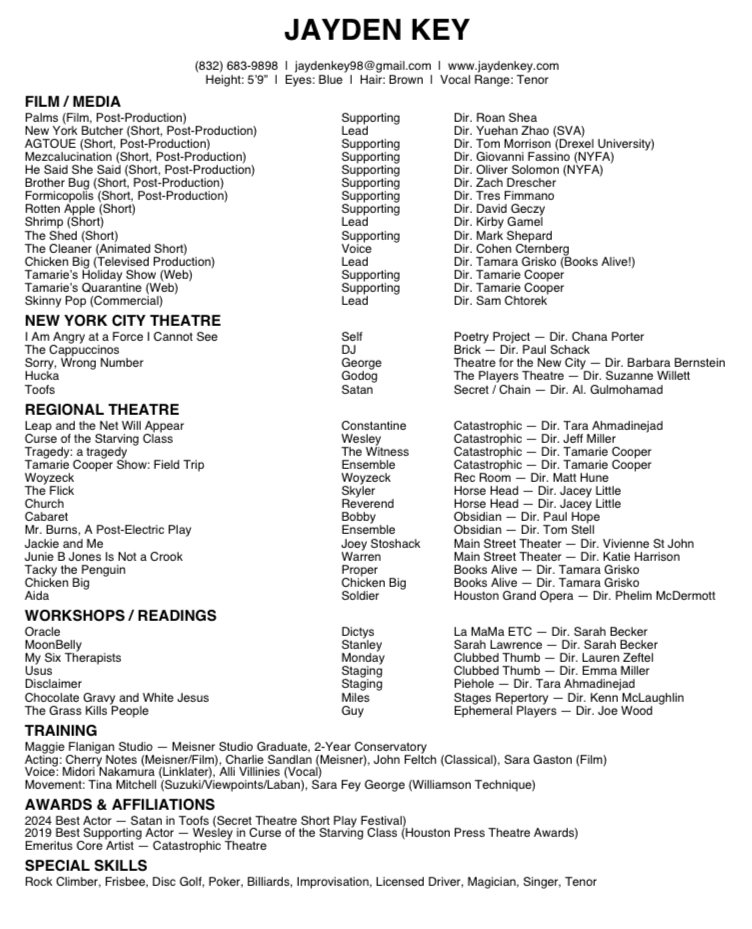Jayden Key is a Houston-born, New York–based actor and graduate of the Maggie Flanigan Studio Meisner Program. He broke through at Houston’s Catastrophic Theatre in 2018 with Leap and the Net Will Appear (dir. Tara Ahmadinejad) and won the 2019 Houston Press Theatre Award for Best Supporting Actor as Wesley in Curse of the Starving Class, later being named an Emeritus Core Artist with the company. Now based in New York, Jayden has additional training in Suzuki, Viewpoints, Laban, the Williamson Technique, and Linklater voice.